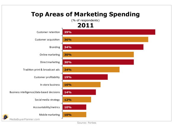 The largest portion of marketing budgets are now focused on customer retention first and customer aquisition second and branding third. Over the next year, 56% of respondents said that they will increase their online marketing spend, 54% will increase their social media spend, and 50% will increase their mobile marketing spend.