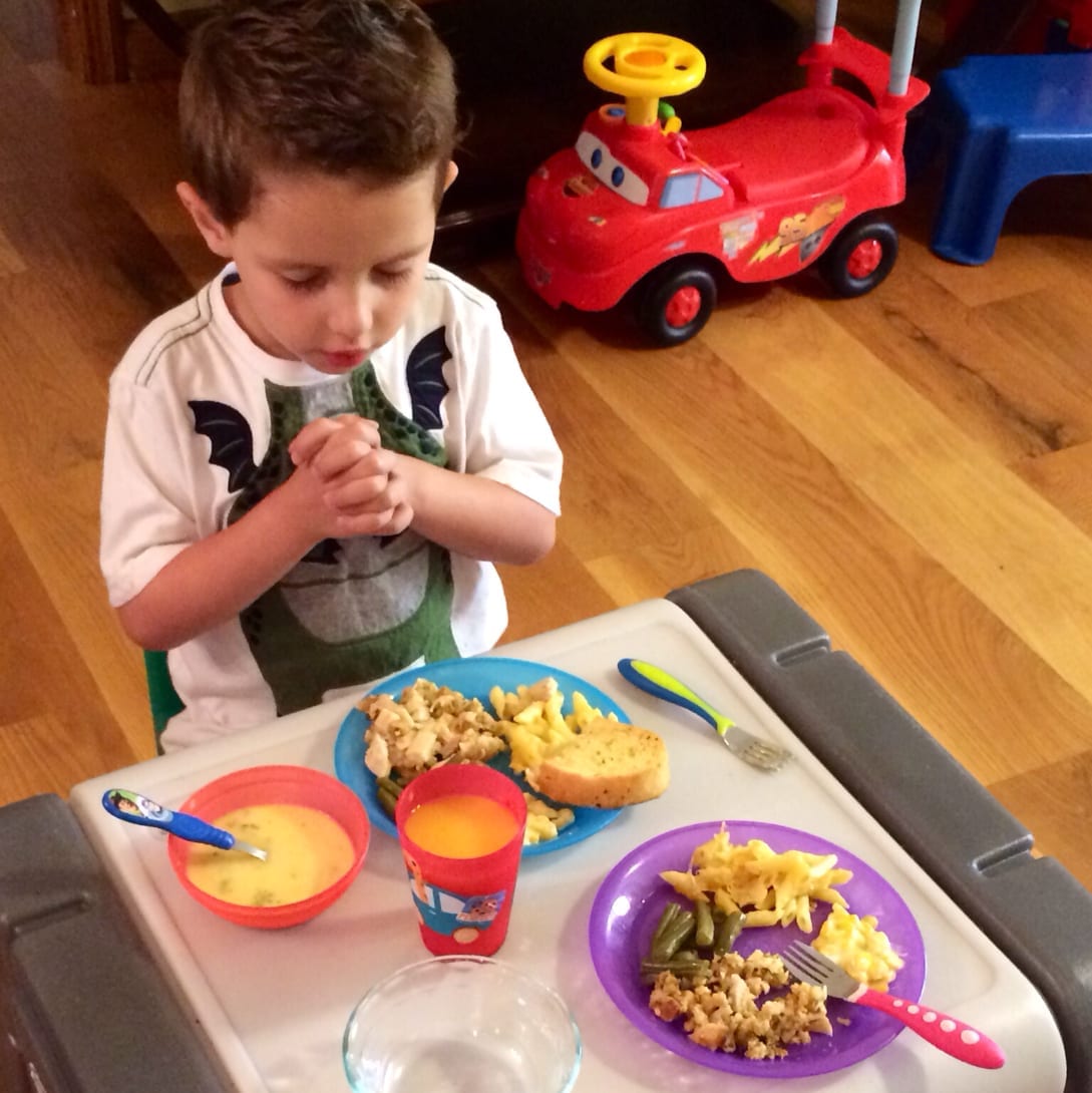 Daniel saying his prayers before dinner. Love his tender little heart.